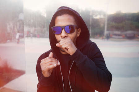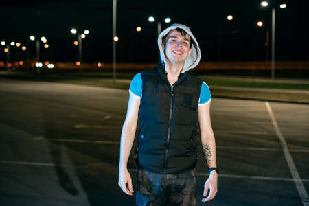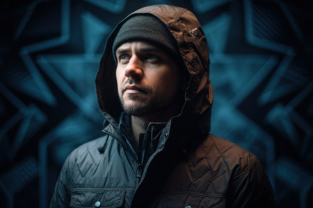 Modern Epic portrait of bboy in a neon light hoodie. Beneath the hood. Dark face. Mysterious and cool.