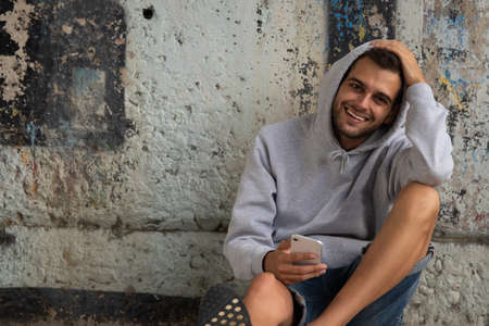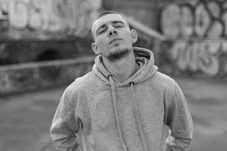Young handsome man wearing a hoodie in an urban context with graffiti