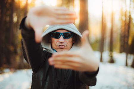 A man wearing a jacket with hood and standing in a meadow with sunlight in the morning. Winter season concept.