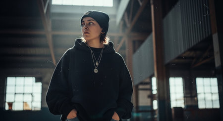 Portrait of a beautiful young woman in a black coat and hat posing in an industrial building.