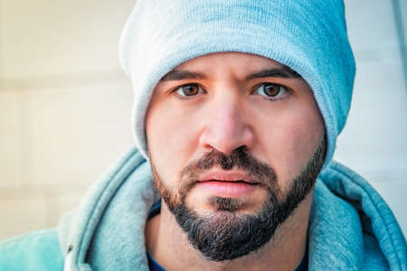 Conceptual art portrait of spooky weird beautiful handsome young middle east brunette blue eyes man face with beard, wearing blue hoodie, looking in camera