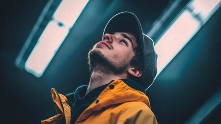 A young man dressed in a yellow jacket stands indoors, gazing upward with a thoughtful expression. Modern lighting creates a vibrant urban atmosphere.