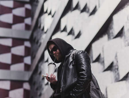 Hipster man with coffee cup and on street over urban background
