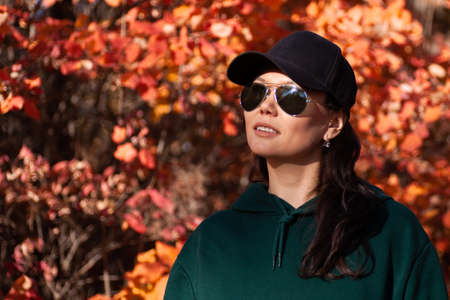 portrait of a beautiful young woman in a cap and sunglasses in the autumn forest at sunset