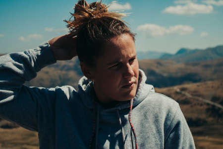 Happy 20-year-old girl on top of a mountain in Andorra.