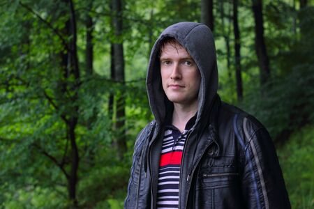 Hooded person in forest with problems, youth and crisis