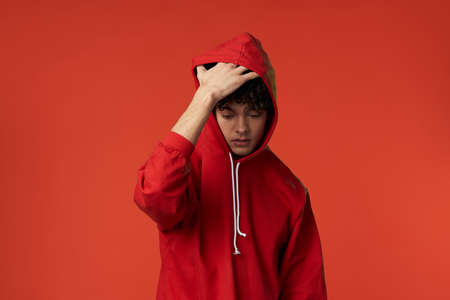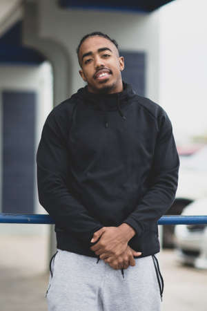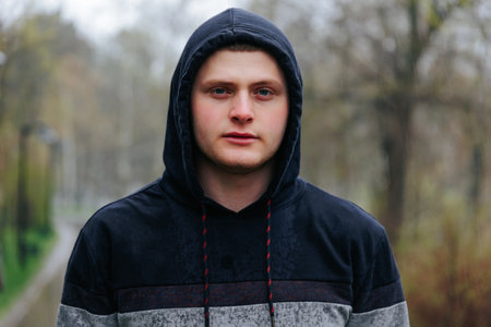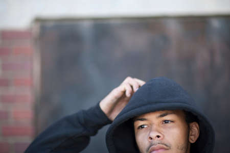 Guy in sportswear putting on his hoodie and looking at the camera. Attitude.