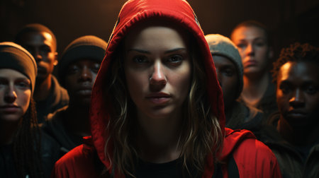 Group of differently colored hooded hackers with side light diversity cybersecurity concept