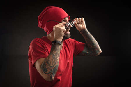 Studio portrait of young confident man wearing round sunglasses and orange beanie hat on background of blue color.