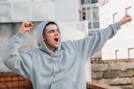Portrait of a young sport athlete man in hoodie standing at the urban bridge