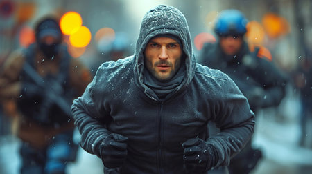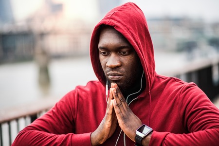 A close-up of black man runner with earphones and hood on his head in a city. Copy space.