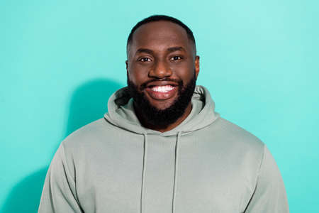 Portrait of attractive cheerful content guy wearing hood good mood isolated over vibrant teal turquoise color background