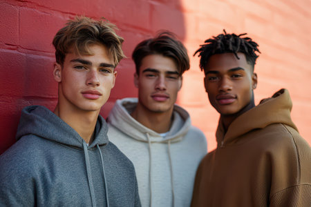 Three young men stand closely together wearing casual hoodies. They are in front of a vibrant red wall enjoying a moment of camaraderie.