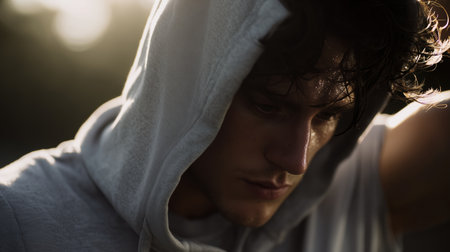 Young man in hoodie exercising outdoors during sunset with sweat on forehead