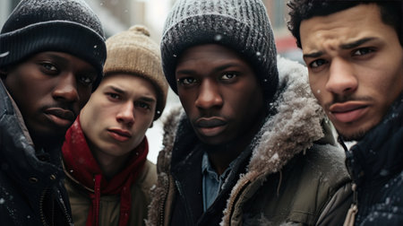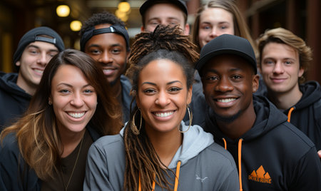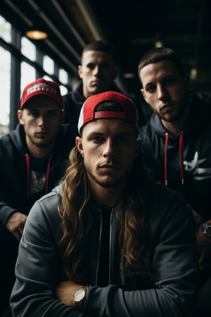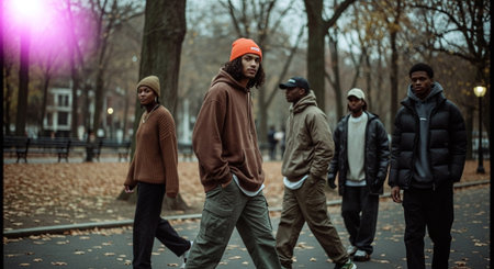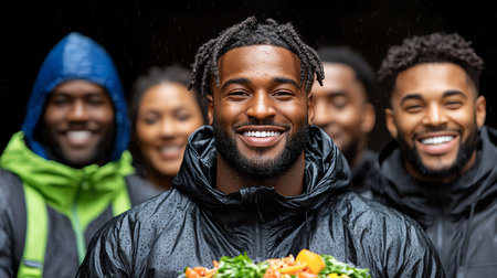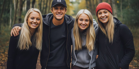 Close friends Group of young men in sports clothing gesturing and smiling while standing outdoors : Generative AI