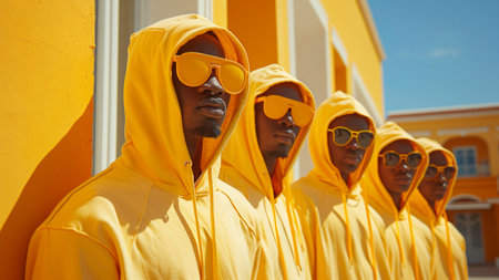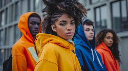 Teenagers in bright stylish hoodies of different colors. Modern street fashion for young people, students. Concept fashion, clothing, diversity, modeling, blank hoodies. Generative ai.