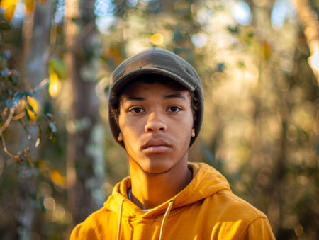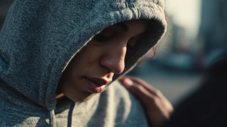 A contemplative youth in a cozy gray hoodie gazes downward, as a gentle supportive touch provides reassurance amid a calm cityscape with muted tones.