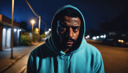 Conceptual art portrait of beautiful handsome gothic young middle east brunette man with blue eyes, beard, wearing blue hoodie, outside in street looking away up
