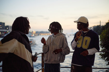 Three young adult men standing outdoors near waterfront, engaging in conversation, cityscape and water visible in background