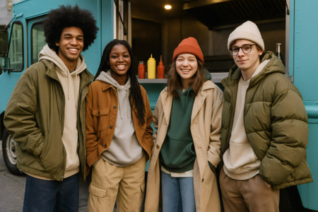 Four cheerful young students standing together in front of a food truck, enjoying a casual meal during their break