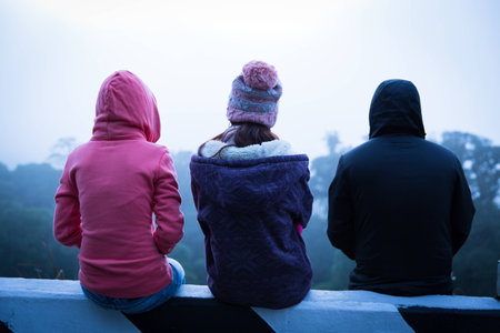Young Indian boy standing on the top of cliff wearing a snow jacket and track pants. Enjoying and freedom concept.