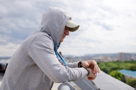 Young man is resting on the roof of the building
