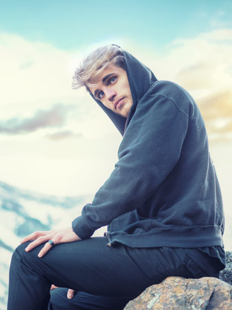 Handsome man profile hooded man on the mountain is looking intently