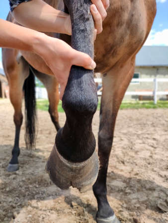 Closeup view of a hand holding broken hoof of a brown horse standing on the sandy ground. Damaged horse hoof. High quality photo