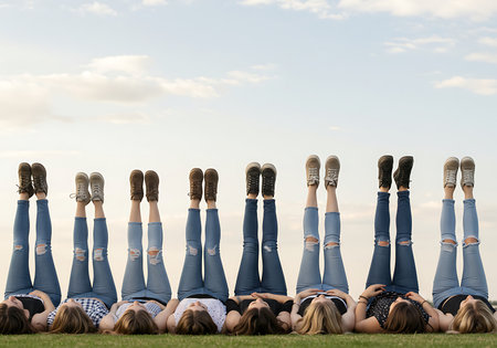 A group of teenage girls are lying on a grassy field, with their legs in the air. Generative Ai