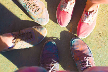 Friends put their feet as a sign of unity and teamwork. Holi festival of color. top view