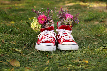 Shoes with beautiful flowers on grass outdoors
