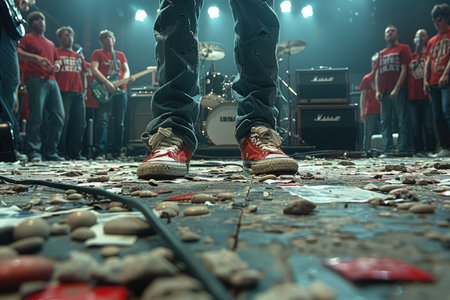 Red Converse Sneakers on a Stage Covered in Guitar Picks