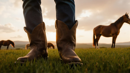 Worn boots and a peaceful grazing horse. The golden light of the sunset adds a warm and inviting feel to the scene.