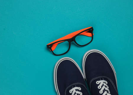 Hipster look. Classic sneakers and stylish glasses without lenses