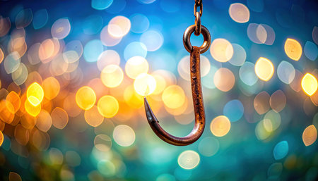 A rusty fishing hook is suspended against a vibrant bokeh background of blurry lights in shades of blue and orange.
