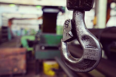 Powerful hook crane close-up. Against the background of the industrial plant. Industrial background.