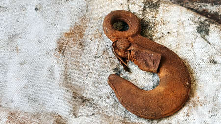 Rusty hook on a dirty protective gloves close-up. Idustrial background with copy space.