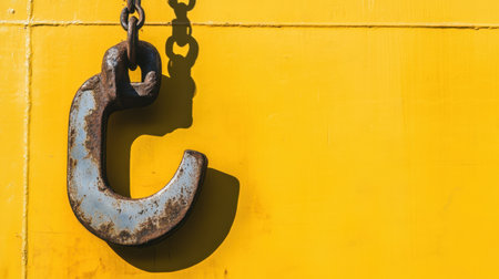 Close-up of a rusty metal hook hanging from a chain against a vibrant yellow background, emphasizing industrial elements and textures with a visible shadow.