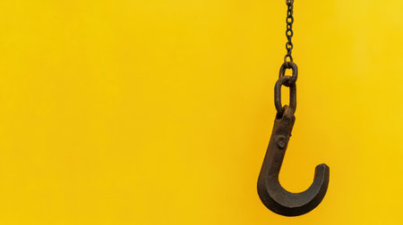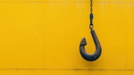 A close-up image of a heavy metal hook suspended from a chain, set against a vibrant yellow industrial wall, emphasizing color and form in construction settings.
