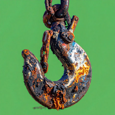 A close-up detail shot captures the heavily textured surface of a weathered industrial lifting hook. Years of use and exposure have created a rich patina of rust, chipped paint, and corrosion, telling a story of heavy labor and enduring strength. Isolated on a solid green background for easy compositing.