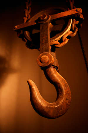 A close-up view of a worn, rusty hook lying on a rough surface, its texture rich with age and history. Soft, diffused light accentuates the hook's curves and imperfections, highlighting its rustic charm in an industrial setting.