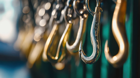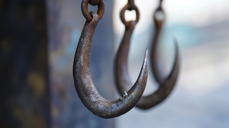 The image depicts several old worn metal hooks suspended in a workshop showcasing signs of corrosion and usage over time.