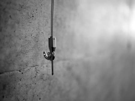 In selective focus of small hook with rope on grunge surface cement wall,abstract art design,blurry light around.