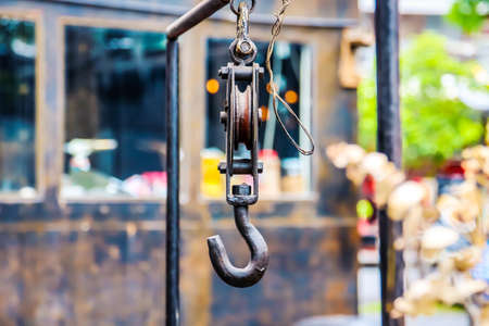 metallic chain handle with red hook in technical room. Crane cargo hook. Concept of maintenance and construction work.