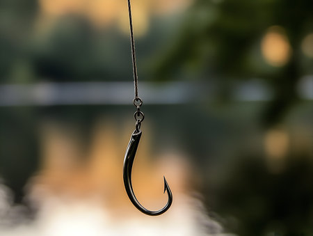 Fishing hook hanging on line with blurred lake background, outdoor angling concept, AI generated image