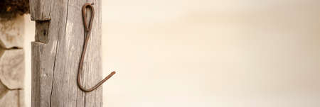 Metal forged hook of brown color on a wooden post of white color. The wall is made of logs and clay. There are cracks and irregularities. Wide beige background with copy space