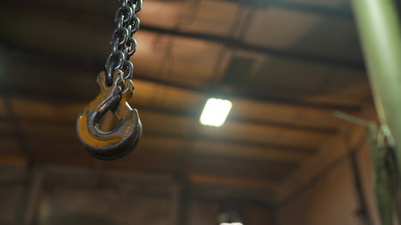 Industrial crane hook and chain hanging from an overhead system, ready for heavy lifting in a manufacturing or storage facility