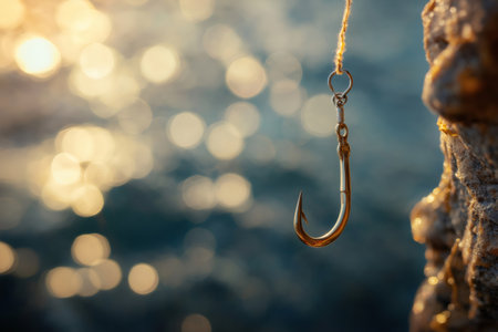 A stunning close-up image featuring a shiny metallic fishing hook hanging from a rugged rope, with sparkling sunlight reflecting on the water's surface, creating a serene marine atmosphere.