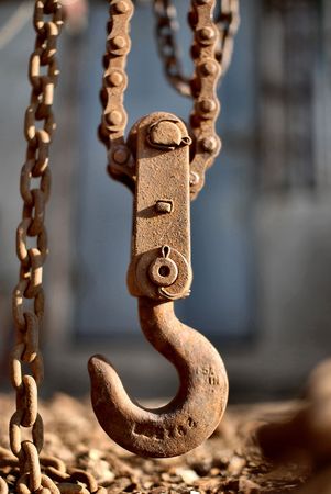 A close-up image showcasing a rusty metal hook hanging from a rope, with a blurred urban background that emphasizes construction and industrial themes in action.