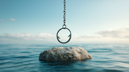 A textured, aged metal hook hangs from resilient steel cords, set against a gentle cityscape blur?combining industrial grit with urban growth themes.